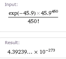 Using the average gain of 45.9 points for next ten models and a gain of 450 points for the top model I decided to calculate Poisson's Number to see what the odds of that model gaining that many points in that time frame. Using the formula below I could not calculate it in Microsoft Excel, so I had to plug it into WolframAlpha instead (pretty much the smartest database on the planet)